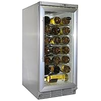 Keep up to 32 bottles properly chilled with this compact freestanding wine chiller--a popular replacement for the trash compactor. The appliance features a glass door for convenient viewing and works great as a show piece in the kitchen or for those just beginning their wine collection. Designed to cycle, the unit's normal temperature fluctuation of 5 degrees prevents it from excessive cycling. Other details include sturdy shelf racking for individual bottle storage, an interior light, a digital display, and a front-venting design, which allows the unit to be built-in under a counter. Attractively housed in beautiful stainless with brushed aluminum trim, the wine chiller measures 23-1/4 by 15 by 34-1/2 inches and carries a one-year limited warranty.