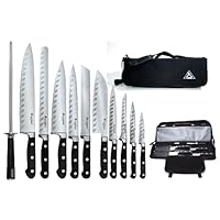Providing professional-grade cutlery at a price an apprentice can afford, this 12-piece knife set makes a smart choice for any busy kitchen. The set includes a 3-1/2-inch paring knife, a 4-1/2-inch paring knife, a 5-inch French boning knife, a 6-inch utility knife, a 7-inch Santoku, and an 8-inch bread knife, as well as an 8-inch slicer, an 8-inch chef knife, a 10-inch chef knife, a 10-inch ham knife, and a 10-inch sharpening steel to help keep the blades in good working order--plus a carrying bag to keep everything neatly contained. The knives come fully forged (not stamped or cast) from a single piece of proprietary German steel and go through a 38-step manufacturing process that includes heat treating and cryogenic freezing to ensure blade stability and maximum sharpness. Each knife also features a comfortable handle, a full tang with bolster for exceptional strength and superior balance, and a scalloped edge (granton edge) that creates fine air pockets between the blade and the food being cut to minimize drag and improve efficiency. Furthermore, the durably constructed chef's bag provides concealed magnetic inserts and polymer sheaths that hold up to 13 knives securely in place for safety and protection from damage when not in use. The bag also offers an accessory pouch for smaller kitchen tools, an industrial-grade zipper closure, and a padded carrying handle and shoulder strap for comfort when transporting. The 12-piece professional knife set measures 22 by 10 by 4 inches and carries a lifetime warranty.