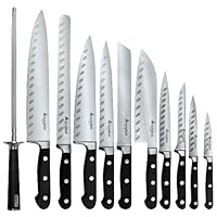 Providing professional-grade cutlery at a price an apprentice can afford, this 11-piece knife set makes a smart choice for any busy kitchen. The set includes a 3-1/2-inch paring knife, a 4-1/2-inch paring knife, a 5-inch French boning knife, a 6-inch utility knife, a 7-inch Santoku, and an 8-inch bread knife, as well as an 8-inch slicer, an 8-inch chef knife, a 10-inch chef knife, a 10-inch ham knife, and a 10-inch sharpening steel to help keep the blades in good working order. The knives come fully forged (not stamped or cast) from a single piece of proprietary German steel and go through a 38-step manufacturing process that includes heat treating and cryogenic freezing to ensure blade stability and maximum sharpness. Each knife also features a comfortable handle, a full tang with bolster for exceptional strength and superior balance, and a scalloped edge (granton edge) that creates fine air pockets between the blade and the food being cut to minimize drag and improve efficiency. The professional knife set measures 18 by 4 by 4 inches and carries a lifetime warranty.