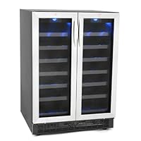 Danby 54-Bottle Dual Zone Built-In orFreestanding Wine Cooler with French Doors Build this sophisticated, dual zonewine cooler with French doors into your kitchen or bar, or use it as a freestanding unit. Made for wine connoisseurs looking for convenience, you can store up to 27 bottles on one side and up to 27 bottles on the other, for a total of up to 54 bottles. With two distinct, separately regulated temperature zones within the cooler, you can store red wine in a warmer zone and white wine in a cooler zone. Set the temperature zones from 39°F to 64°F, which encompasses optimum wine storing temperature ranges. This black colored wine cooler has a stainless steel trimmed door with tinted tempered glass that helps protect your wine from harmful UV rays. It is designed with precise digital thermostats with LED displays, which allow the temperature to be accurately set and monitored through the door. The frost free, fan forced cooling system of this premium win cooler combined with its digital thermostats provides a more consistent thermal temperature than an automatic defrost system. The wine cooler's blue LED lighting beautifully showcases the wine without the heat created by an incandescent bulb and thestainless steel trimmed wire shelves match the stainless steel exterior. Features: Capacity:5 cubic ft. or up to54 wine bottles French doors housing 2 distinct, separately regulated temperature zones Maintains 39°F to 64°F Built-in or freestanding application Exterior color: black with stainless steel trim Tinted tempered glass door protects wine from UV rays Frost free, fan forced cooling system for more consistent thermal temperature Stainless steel trimmed wire shelves LED lighting beautifully showcases wine 1 Year limited warranty Model: DWC2727BLS