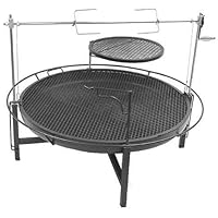 (More customer reviews)Well, I could not find one review on this product no matter where I looked so here is my opinion. I took a risk and bought this as it seemed to fit the bill for me. It is similar to a Santa Maria style grill (meaning the grill can be raised or lowered over the fire) has many options such as swing outs and a rotisserie. Well, I cooked 20 burgers tonight in no time flat and have my beef brisket cooking slowly over the fire tonight. The grill quality was pretty good and for the price it is money well spent. I mean from a barbecue stand point some air vents at the bottom would be nice but from a fire pit standpoint it would be unneccessary. Long story short, I would buy this again as it is very convenient and easy to use. I would recommend natural lump charcoal and it does not take much to produce a great low flame fire.