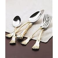 Elegant sprays of flowers and vines are accented in gold on fine stainless steel. A perfect complement to your Royal Albert Old Country Roses Dinnerware as well as other dinnerware collections. Set includes 12 of each of the following: dinner fork, dinner knife, salad fork, soup spoon and teaspoon. Also includes a butter knife, sugar spoon, serving fork, serving spoon and pierced serving spoon. Comes in a handsome wooden chest.