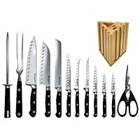 Providing professional-grade cutlery at a price an apprentice can afford, this 13-piece knife set makes a smart choice for any busy kitchen. The set includes two 3-1/2-inch paring knives, a 4-1/2-inch paring knife, a 5-inch boning knife, a 5-inch tomato knife, a 6-inch utility knife, a 7-inch Santoku, and an 8-inch bread knife, as well as an 8-inch chef knife, a carving fork, a pair of scissors, and a 10-inch sharpening steel to help keep all the blades in good working order. The knives come fully forged (not stamped or cast) from a single piece of proprietary German steel and go through a unique tempering method that ensures blade stability for maximum sharpness. Each knife also features a comfortable handle, a full tang with bolster for strength and superior balance, and a scalloped edge (granton edge) that creates fine air pockets between the blade and the food being cut to minimize drag and improve efficiency. A beautiful, triangular-shaped, rotating wooden block comes included for safely storing the knives when not in use and for making it easy to quickly find just the right knife for the task at hand. The professional knife set measures 10 by 10 by 18 inches and carries a lifetime warranty.