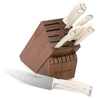 Create culinary masterpieces in your home with this 8-piece set of professional-quality Wusthof Classic Ikon knives, featuring an innovative handle design in off-white This 8-piece block set includes a 3-1/2-inch parer, 4-1/2-inch utility, 6-inch sandwich knife, 8-inch bread knife, 8-inch chef knife, 10-inch sharpening steel, and kitchen shears as well as a 17-slot walnut wood storage block.