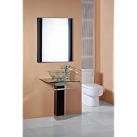 For a spacious look in a small space, this stylish vanity pedestal sink set is perfect. The vanity is ofsolid birch finished in rich espresso -so dark brown to be almost black. The pedestal has 2 stainless steel end capswith the very popular brushed nickel finish. The towel bar mounted in the convenient place is brass constructed with achrome finish. The counter top is of tempered glass 5/8" thick. Vanity set includes clear vessel sink, and 13" waterfallfaucet. Buy as a set and get this deal for the retail price of the vessel sink alone.Tempered glass counter top * Dimensions: 23-5/8" W x 19-5/8" D * Thickness: 5/8"Clear tempered glass sink * Color: Clear * Dimensions: 16-1/8" diameter x 6" * Thickness: 1/2"Pedestal * Finish: Espresso * Height: 28-1/2" highWaterfall Faucet * Material: Fully brass constructed * Disc: Ceramic disc * Configuration: One-hole * Finish: Polished chrome