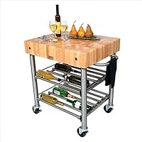 CUCD15WCInnovativekitchen cartwith wine rack in maple Kitchen Cart Features: -Solid hard rock maple top. -Food-service-grade stainless steel frame construction. -5'' Thick end-grain work surface. -Cream finish with beeswax. -Proudly made in the USA. -Stainless steel towel bar. -Commercial-grade locking casters. -Double wine rack shelving system stores up to 24 bottles. -Recessed electrical outlet strip for easy appliance connection. -Also available in American cherry. -Some assembly required. -Overall dimensions: 35'' H x 30'' W x 24'' D. -One-year warranty against defects in workmanship and materials. John Boos recommends oiling your butcher block every 3 - 4 weeks. Protect your investment with John Boos Mystery Oil! Please Note: John Boos products with a varnique finish require a John Boos cutting board during food preparation to prevent damage to the finish John Boos: A Commitment to Eco-Friendly Practices: John Boos & Co is firmly committed to managing environmental matters as an integral part of their business practice. It is their policy to ensure the environmental integrity and consideration of their processes and facilities at all times. They maintain a high standard of recognition in treating our environment with respect while manufacturing their products. Some of the steps they take to keep this promise include: -Using only formaldehyde-free and low-emission formaldehyde gluing processes in manufacturing their butcher blocks. -Selecting individual trees for harvest, encouraging forests to renew and regenerate themselves naturally and prolifically. -Maintaining active recycling programs, with 95pct of all raw materials, scrap, and sawdust being recycled as fuel to heat their kilns. With John Boos, the truth is black and white: they're green!