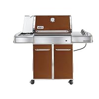 Weber Genesis EP-320, LP, Premium Gas Grill, Copper, Features An Enclosed Cart With Corresponding Painted Steel Doors, Stainless Steel Handles & Accent Colored Painted Side & Rear Panels, Grills Have Accent Colored Painted Steel Frame & A Porcelain Enameled Shroud With A Center Mounted Thermometer & Accent Colored Painted Cast Aluminum End Caps, Cooking System Is Rated At 42,000 BTUs, Plus 12,000 BTU Per HR Input Flush Mount Side Burner, Includes 3 Seamless Stainless Steel Burners & A Crossover Ignition System, Cooking Grates Are 7MM Diameter Stainless Steel Rods With Stainless Steel Flavorizer Bars, Primary Cooking Area Measures 507 SQIN, Warming Rack Area Measures 130 SQIN, Giving A Total Cooking Area Of 637 SQIN, Other Features Include 6 Tool Holders, Precision Fuel Gauge, 2 Heavy Duty Front Locking Casters & 2 Heavy Duty Back Swivel Casters, LP Tank Not Included, Limited Warranty, Weber Cookbook Included, Premium Features Include Stainless Steel Grates & Flavorizer Bars.